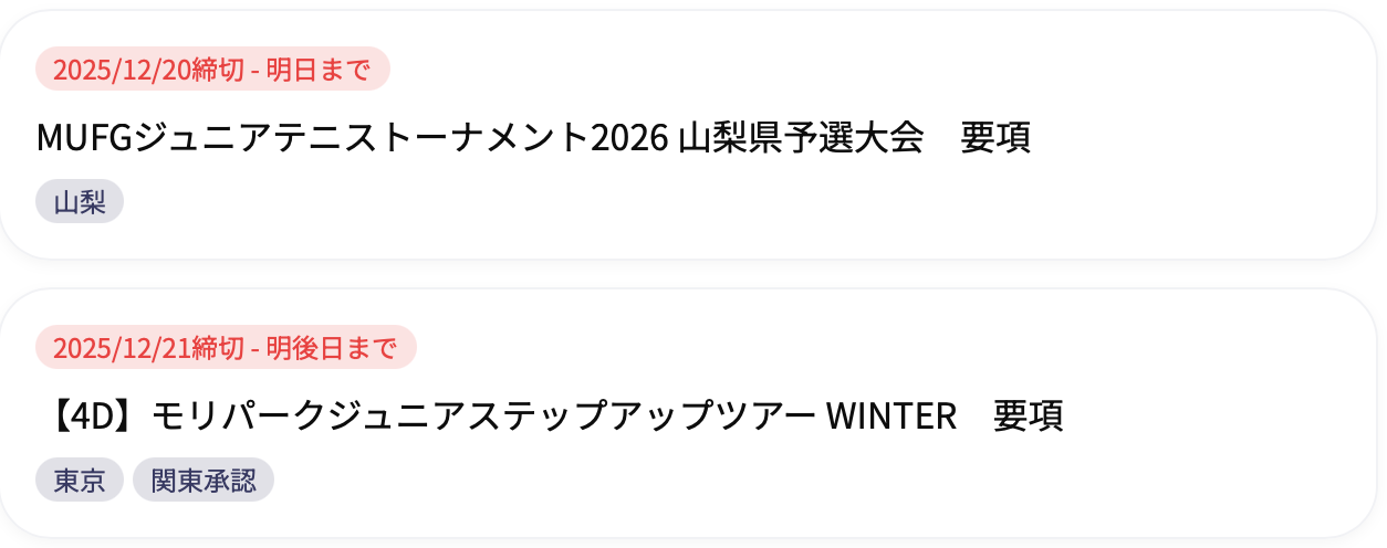 締め切りが迫った大会が視覚的に分かりやすくなり、優先して確認すべき大会を見落としにくくなります。